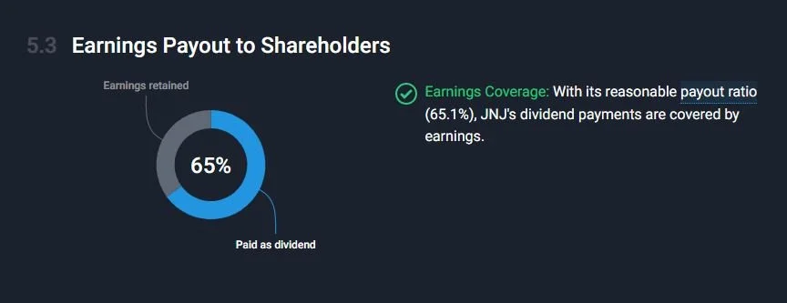 Payout ratio: The percentage of earnings paid out as dividends. A lower payout ratio indicates that a company has room to increase its dividend, while a high ratio may signal an unsustainable dividend. A healthy payout ratio is generally under 60%-65% for most industries (not including Real Estate Investment Trusts — REITs — which generally have higher payout ratios due to the nature of their business models), but the lower, the better. As per the simplywall.st image below, JNJ stock has a healthy payout ratio of 65%.
