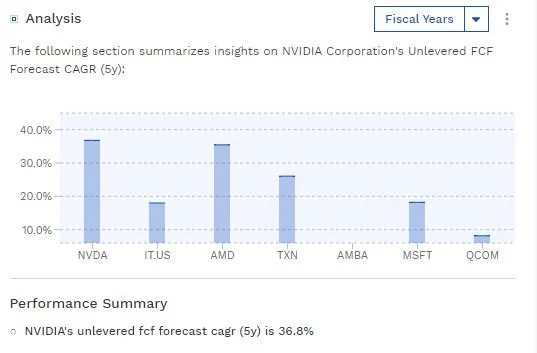 Expected free cash flow growth: Looking at its forecasted free cash flow growth, NVDA is expected to grow its FCF by 36.8% per year for the next five years, according to Finbox — not bad at all. When looking at it through this lense, it’s possible that NVDA’s high valuation is justified.
