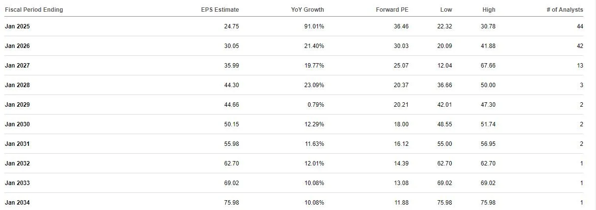 Expected EPS growth: As you can see below for Fiscal 2025, 2026, and 2027, NVDA’s EPS is expected to grow by 91%, 21.4% and 19.77%, respectively. After that, the number of analysts making projections comes down considerably, so the numbers are less reliable. But overall, analysts expect double-digit growth. By Fiscal 2027, its forward P/E comes down to 25x.