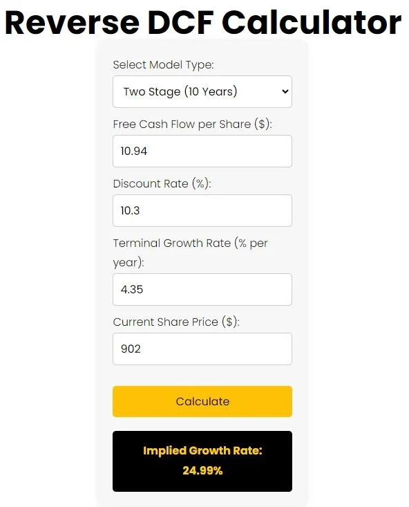Put into simpler terms: if you buy at $902 and NVDA achieves 24.99% free cash flow growth for the next 10 years and 4.35% growth per year after that (perpetually), you can expect to make 10.3% returns per year. If you think NVDA will outperform those growth expectations, then you can make more than 10.3%, and vice versa.