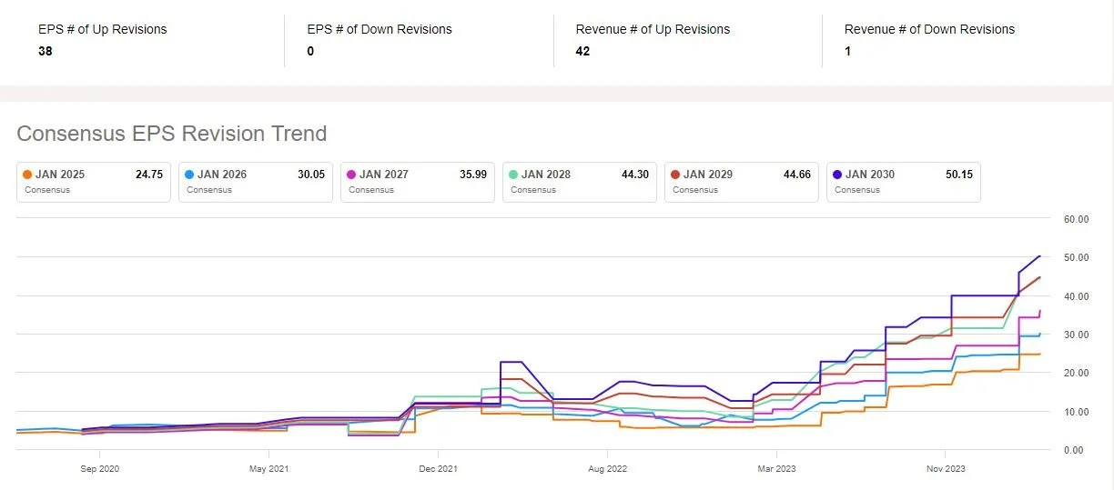 The good thing is that this trend can continue, and NVDA can keep blowing past estimates, which will drive the stock higher. The bad thing is that if NVDA ends up missing estimates and earnings expectations get revised lower, the stock can crash big, as investors have been spoiled by NVDA lately. See the past EPS revisions below.
