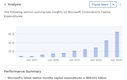 Microsoft’s Azure growth matters, but what also matters is whether margins hold while CapEx stays elevated. Microsoft’s CapEx has increased quickly in the last few years. See below.