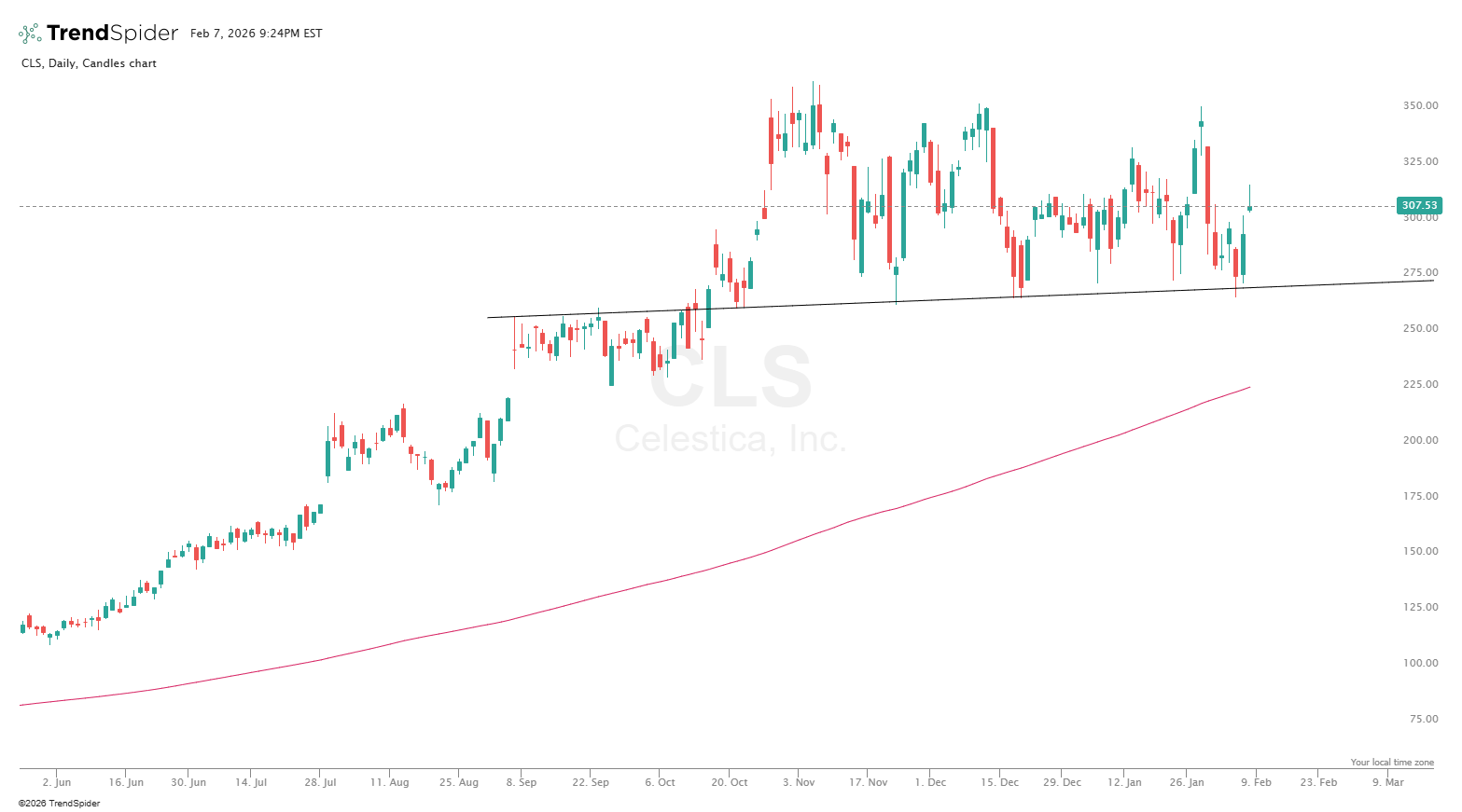 This one avoided the heavy sell-offs that tech stocks saw last week. Relatively strong, which I like. It’s still holding up above that trendline.