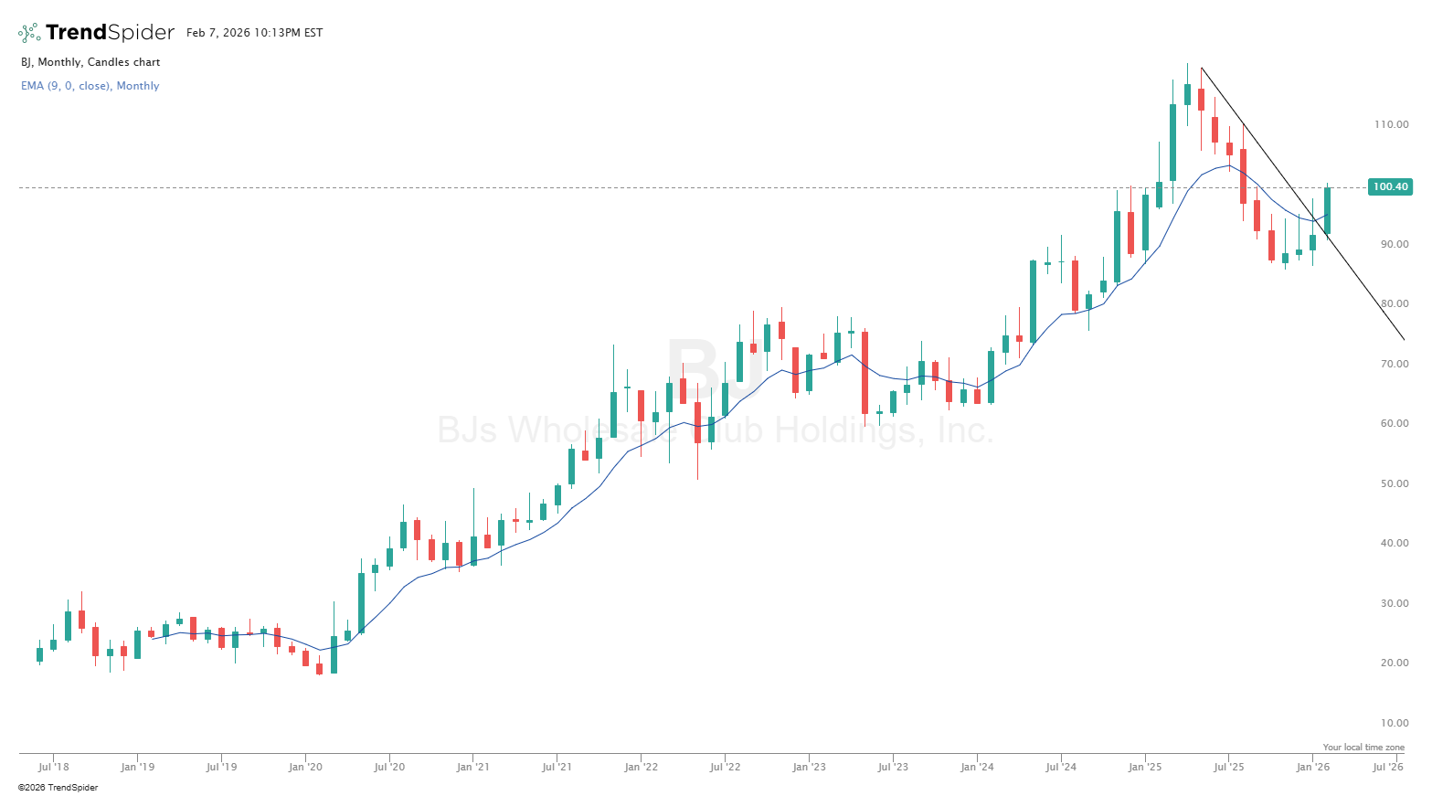 Retailer BJ’s Wholesale is setting up for its next leg higher, can we agree on that? If the market volatility is getting to you, this is a great stock to consider, with its 0.37 beta and steady fundamentals. This is not the type of stock that gets caught in a panic, so it can provide diversification in that sense. A dip to the $97 level is worth watching for.