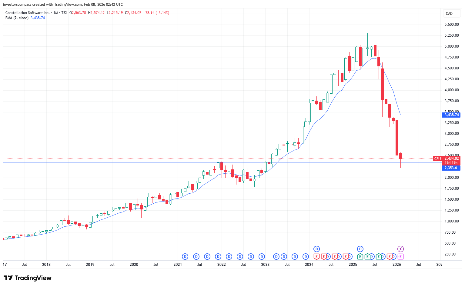Absolute bloodbath in Constellation Software, which was historically been one of Canada’s best companies. If you don’t know what this company does, it’s basically a company that acquires software companies. That’s its business model.