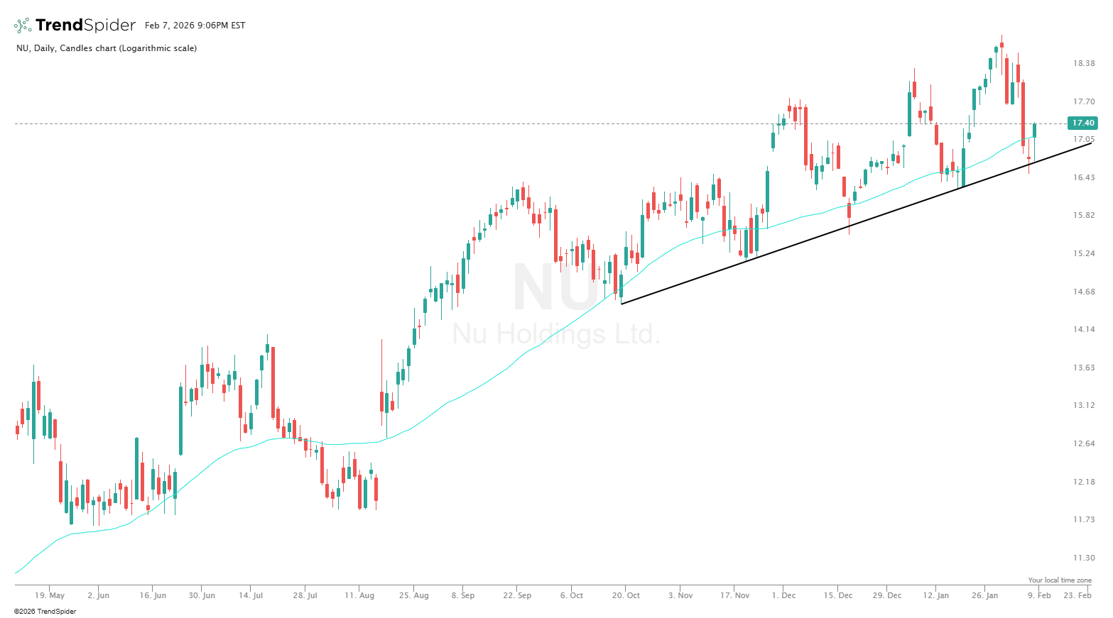 Importantly, the stock is trending higher, and it looks like it’s heading for $20, bouncing off that diagonal support. I think the trend remains strong as long as the stock stays above $16.50 for now (the latest swing low). But keep in mind that it’ll report earnings on February 25.